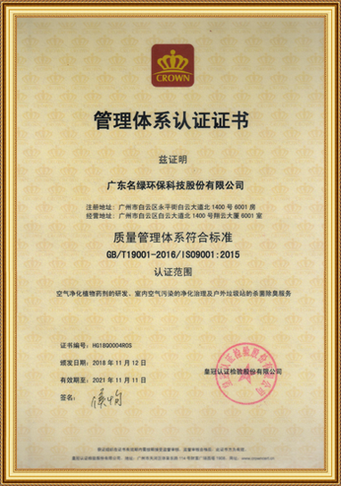 名綠環(huán)保成立于2015年,是國內(nèi)早期從事室內(nèi)環(huán)境污染治理的先行企業(yè),經(jīng)近5年的發(fā)展,已形成集研發(fā)、治理、銷售、服務(wù)一體化的專注室內(nèi)空氣凈化的環(huán)保公司。獲得數(shù)十項(xiàng)國家專利、榮譽(yù)和資質(zhì)體系認(rèn)證。